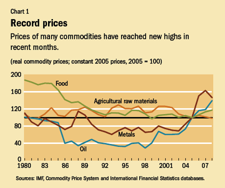 Commodity markets have been booming. Prices of many commodities—especially those of oil, nickel, tin, corn, and wheat—have reached record highs in recent months despite credit market turbulence and slowing activity in many major advanced economies (see Chart 1). The current boom has also been more broad based and longer lasting than is usual, and it contrasts noticeably with the 1980s and 1990s, when most commodity prices were on a downward trend. That said, despite the apparent reversal of the downward trend, inflation-adjusted prices of many commodities are still well below the levels seen in the 1960s and 1970s.