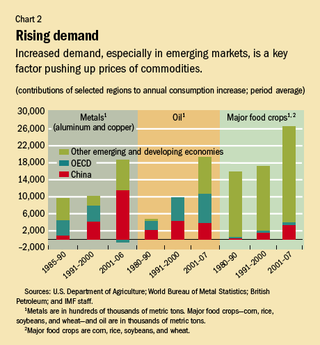 First, emerging economies have driven demand for various commodities—a trend that is likely to continue. Annual increases in the global consumption of major commodity groups during 2001–07 were larger than they had been during the 1980s and 1990s (see Chart 2). And although buoyant global growth was a key contributor, it was reinforced by a combination of strong per capita income growth, rapid industrialization, higher commodity intensity of growth, and rapid population growth in some major emerging economies (notably China, India, and in the Middle East). All of these factors have contributed to the rapid pace at which demand has grown in recent years.