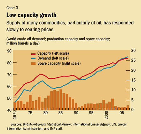 Besides initial supply-response problems, however, a new key feature that has emerged in the current broad-based commodity market boom is the increasingly prominent role of the slow supply adjustment to increased demand. Such structural problems have been particularly acute in the case of oil, where capacity growth in response to persistently higher prices has been disappointing in recent years (see Chart 3). And, as the pessimistic prospects for capacity growth have seemed more certain, these expectations have further fueled price pressures. This was particularly the case in 2007. Key handicaps have been the declining average size of fields and the technological challenges involved in the increasing reliance on exploiting nonconventional fields (for example, deep sea fields or oil sands). These supply rigidities, together with soaring demand for oil equipment and services, have pushed up costs dramatically. As a result, despite a 70 percent increase in nominal investment during 2004–06, real investment in the upstream sector has barely grown. Although some of the cost increases related to the high demand for inputs are cyclical and should subside once oil equipment and skilled labor supply catch up, those related to geological and technological problems are likely to persist for some time.