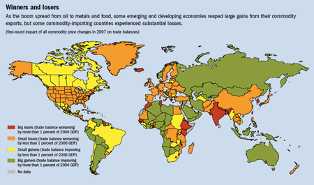 From a broader perspective, the impact of higher commodity prices on global growth and inflation is not the only concern. Large-scale commodity price increases can raise external vulnerabilities of low- and middle-income net commodity importers through the deterioration in their trade balance. In this respect, the gradual broadening of the commodity price boom from oil to metals and food has helped many emerging and developing economies offset the adverse effects of higher oil prices through higher prices on their net commodity exports (see map). These commodity-related terms of trade have also boosted real incomes, domestic demand, and growth.